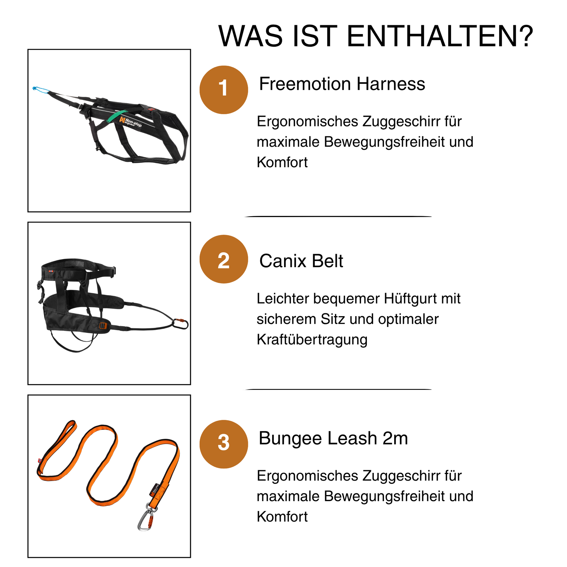 Im Set enthalten ist das bewährte Freemotion Harness, ein speziell entwickeltes Zuggeschirr mit maximaler Bewegungsfreiheit und optimaler Kraftübertragung. Der CaniX Belt 2.0 entlastet deinen Rücken und unterstützt eine stabile Lauftechnik, während die elastische Bungee Leash Stösse abfedert und für ein gleichmässiges, flüssiges Laufgefühl sorgt.
